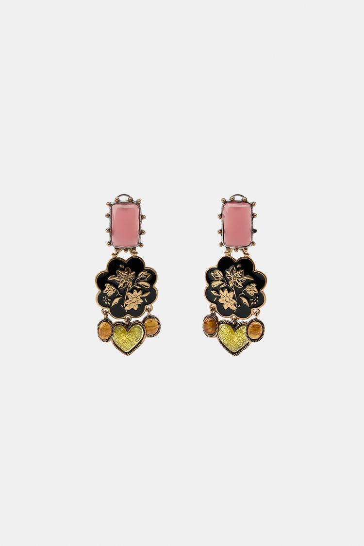 ZARA СЕРЬГИ «КАМЕНЬ, ЦВЕТЫ И СЕРДЕЧКО», ЦВЕТ СОСТАРЕННОГО ЗОЛОТА