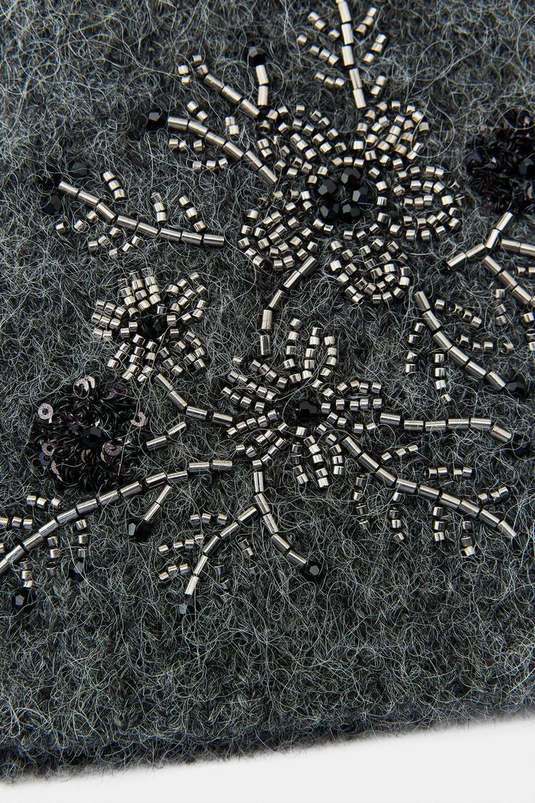 ZARA ШАПКА БИНИ С ВЫШИВКОЙ И БУСИНАМИ, СЕРЫЙ