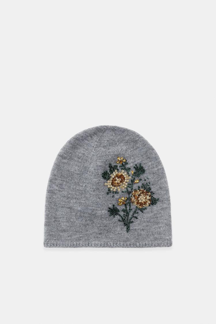 ZARA ШАПКА БИНИ С ВЫШИВКОЙ ЦВЕТОВ И БУСИНАМИ, СЕРЫЙ