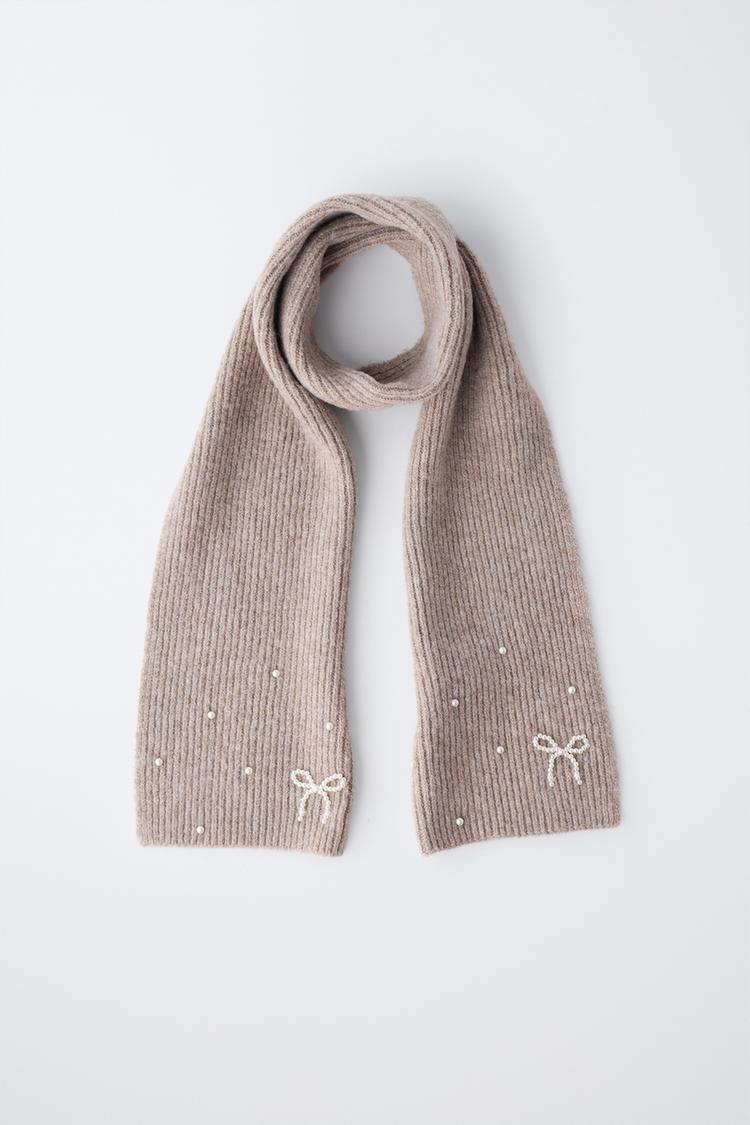 ZARA ШАРФ ТРИКОТАЖНЫЙ С БУСИНАМИ, КОРИЧНЕВЫЙ МЕЛАНЖ