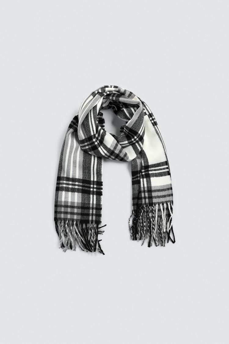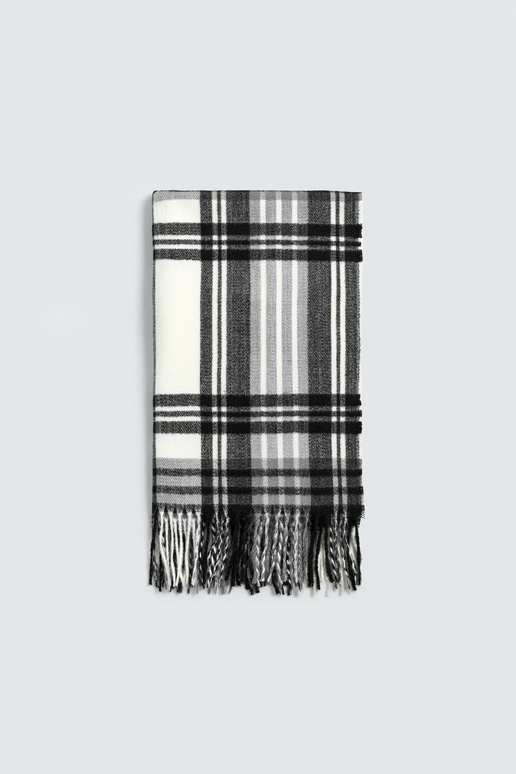 ZARA ШАРФ В КЛЕТКУ С БАХРОМОЙ, ЧЕРНЫЙ/ЭКРЮ