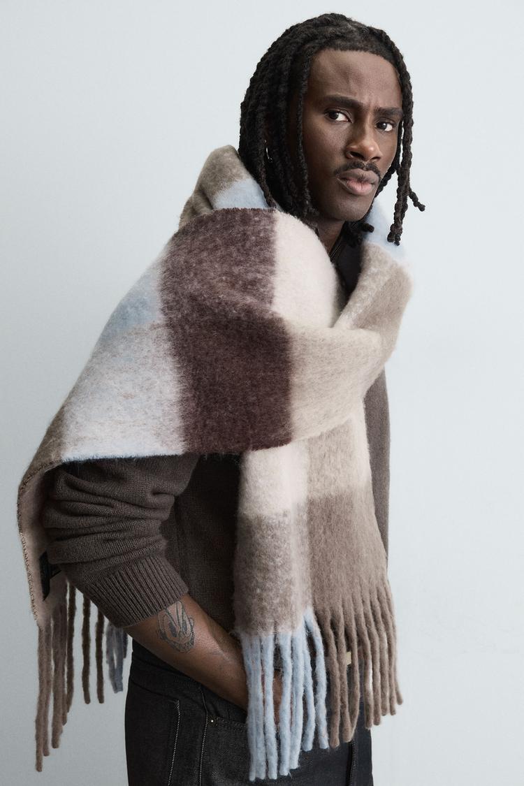 ZARA ШАРФ В КЛЕТКУ С БАХРОМОЙ, КОРИЧНЕВО-СИНИЙ
