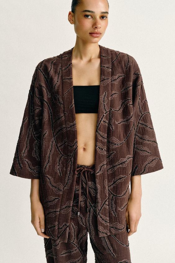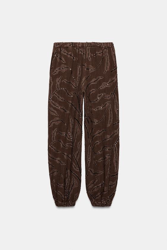 ZARA ШАРОВАРЫ ИЗ МЕТАЛЛИЗИРОВАННОЙ ТКАНИ С ПАЙЕТКАМИ, КОРИЧНЕВЫЙ