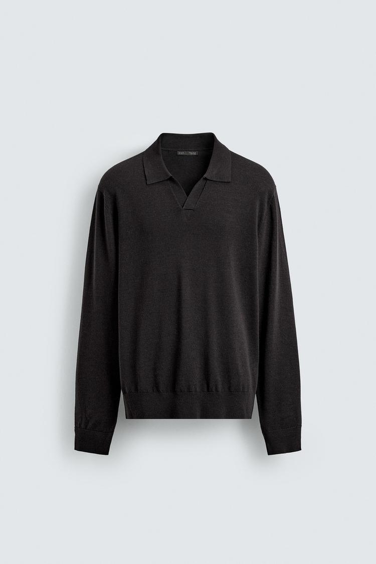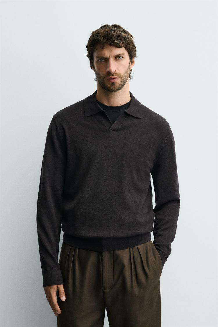 Трикотажное поло классического кроя из шерстяной ткани. Отложной воротник с разрезом спереди и длинные рукава. Детали в рубчик.