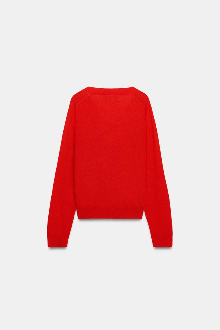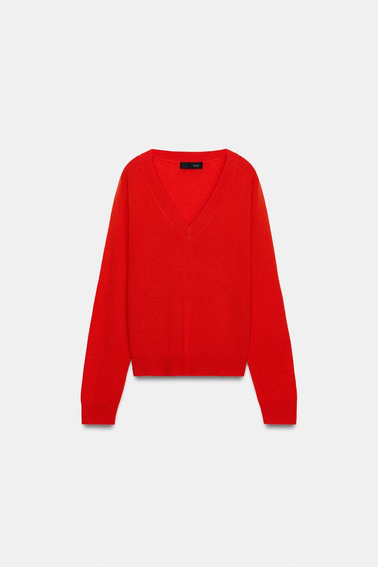 ZARA ШЕРСТЯНОЙ СВИТЕР С V-ОБРАЗНЫМ ВЫРЕЗОМ, КОРАЛЛОВО-КРАСНЫЙ