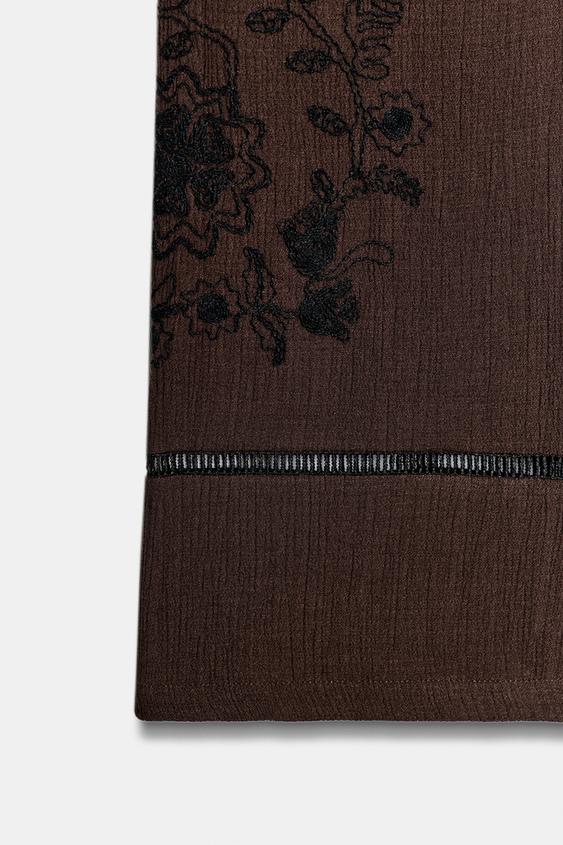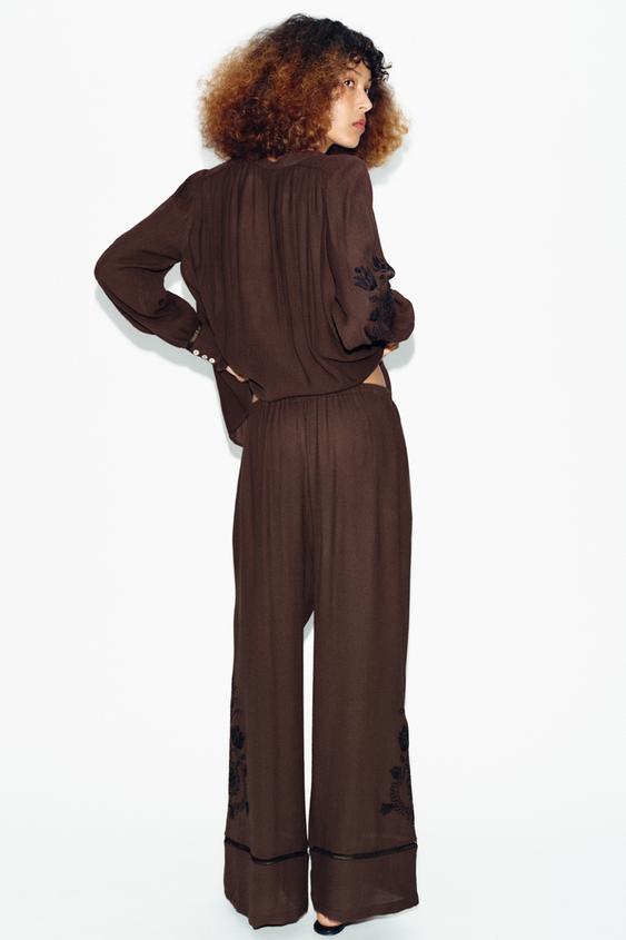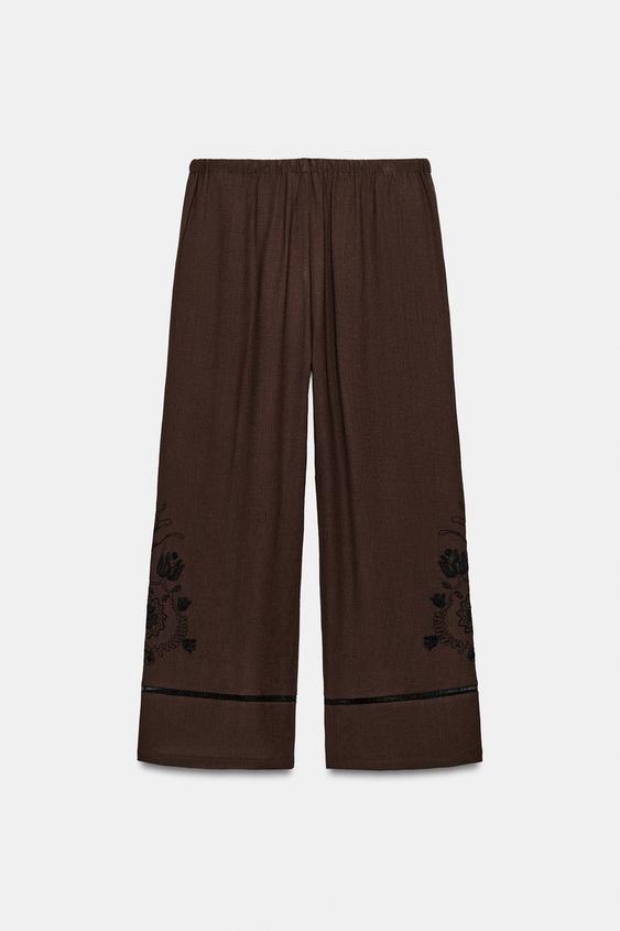 ZARA ШИРОКИЕ БРЮКИ С ВЫШИВКОЙ И КРУЖЕВНЫМИ ВСТАВКАМИ, КОРИЧНЕВЫЙ