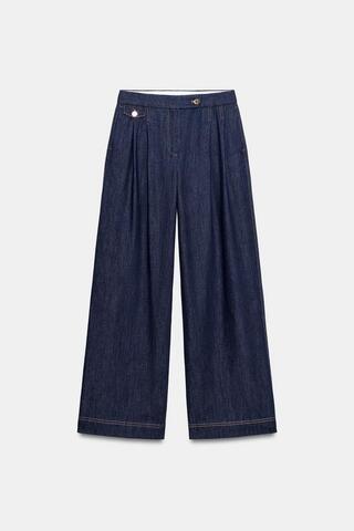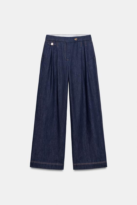 ZARA ШИРОКИЕ БРЮКИ С ЗАЩИПАМИ, СИНИЙ