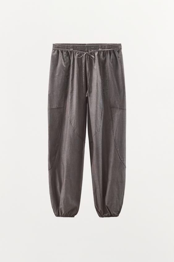ZARA ШИРОКИЕ БРЮКИ В ПОЛОСКУ С ПОЯСОМ, СЕРЫЙ