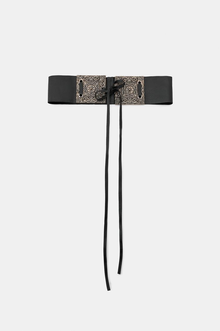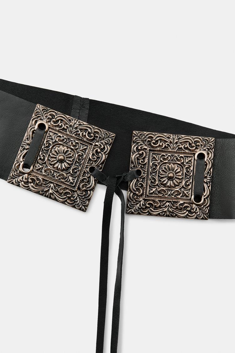 ZARA ШИРОКИЙ КОЖАНЫЙ РЕМЕНЬ С ПРЯЖКОЙ С УЗОРОМ, ЧЕРНЫЙ