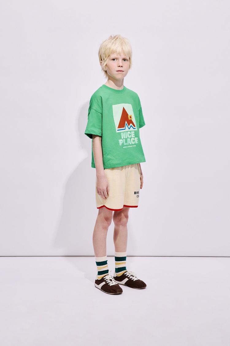 Шорты-бермуды из махровой ткани с эластичным поясом. Передние карманы. Текстовый принт по низу. Контрастная отделка.
