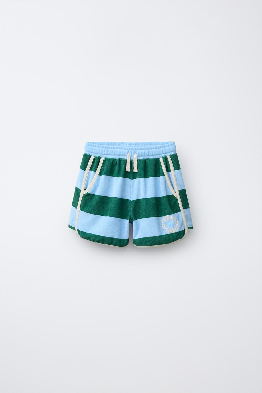 Шорты из махровой ткани с эластичным поясом и регулируемыми шнурками. Карманы и вышитый текст спереди. Полосатый принт и детали в рубчик контрастного цвета.
