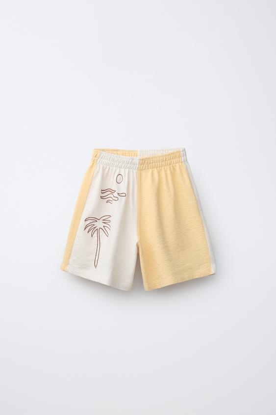 ZARA ШОРТЫ ИЗ МАХРОВОЙ ТКАНИ В СТИЛЕ КОЛОР-БЛОК С ВЫШИВКОЙ, ЖЕЛТЫЙ