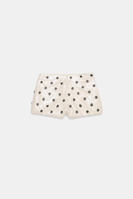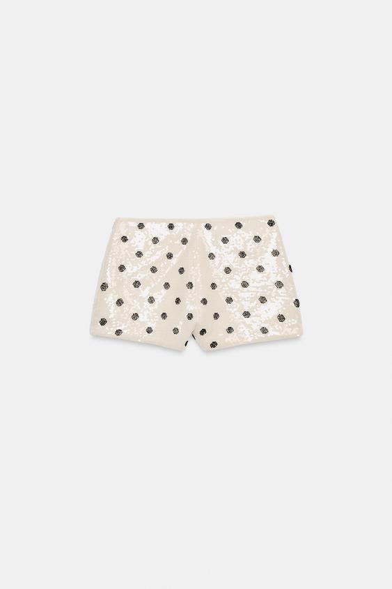 ZARA ШОРТЫ МИНИ С ПАЙЕТКАМИ И ГОРОШКОМ, БЕЛЫЙ/ЧЕРНЫЙ