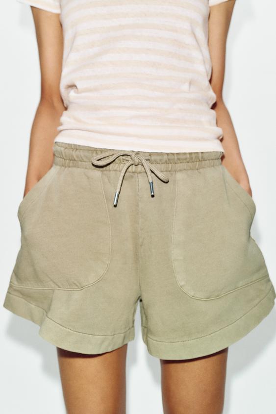 Шорты из хлопчатобумажной пряжи. Средняя посадка, эластичный пояс на шнурке. Накладные карманы спереди. Эффект потертости.