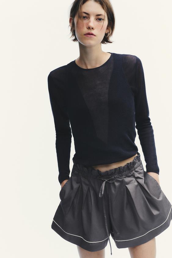 Шорты со средней посадкой и эластичным поясом paper bag, регулируемым шнурками. Боковые карманы, скрытые в шве. Детали со складками и окантовкой снизу.