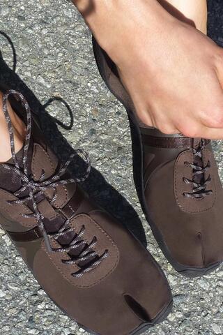 Плоские спортивные туфли. Контрастные текстуры и материалы верха. Носок с разделением для пальца. Задняя петля. Резиновая подошва.