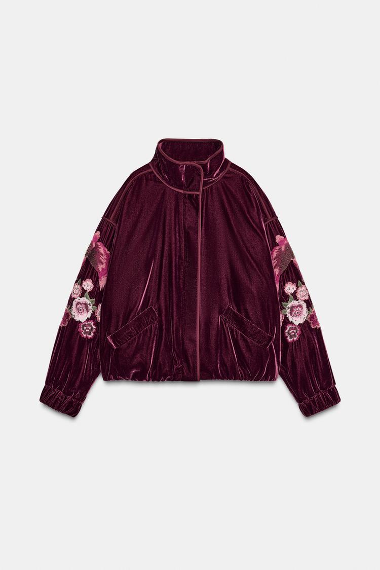 ZARA СТЕГАНАЯ БАРХАТНАЯ КУРТКА С ВЫШИВКОЙ, СЛИВОВЫЙ
