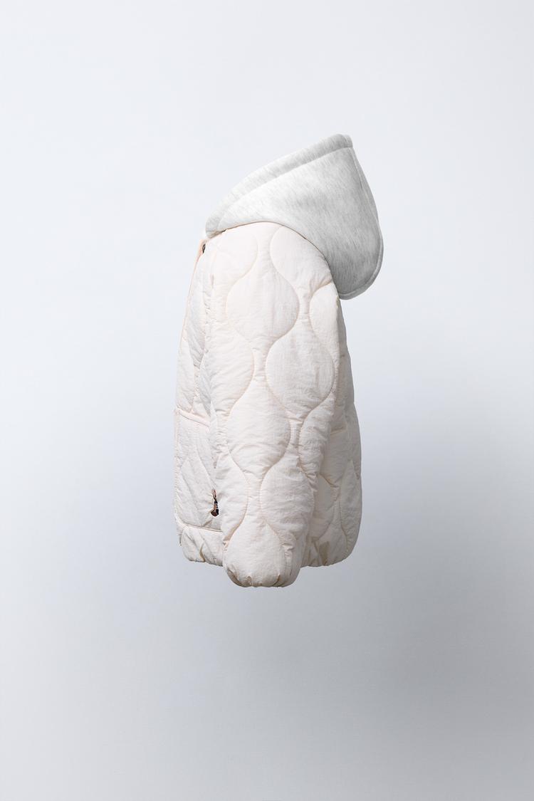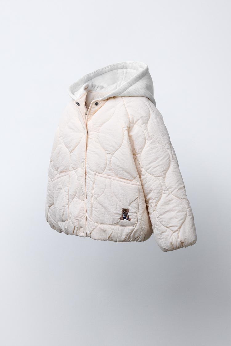 ZARA СТЕГАНАЯ КУРТКА С КАПЮШОНОМ И ВЫШИВКОЙ В ВИДЕ МЕДВЕЖОНКА, ЭКРЮ