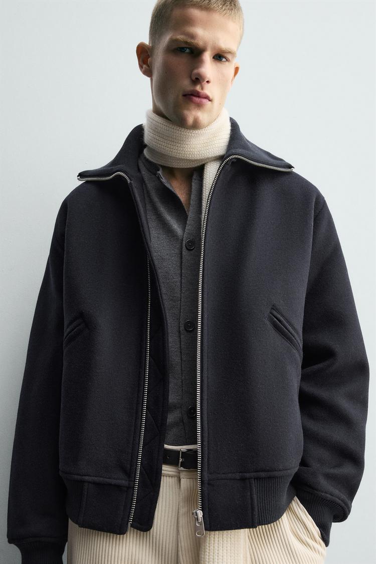 Куртка свободного кроя из шерстяной ткани со слегка стеганой подкладкой. Воротник-стойка в тон из эластичной ткани в рубчик. Длинные рукава. Передние карманы на молнии и внутренний карман. Детали в рубчик. Застежка-молния.