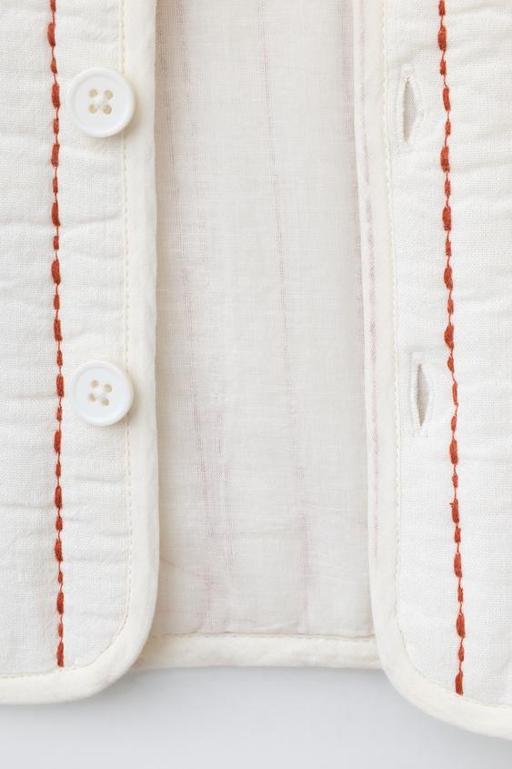 Стеганая куртка с круглым вырезом и длинными рукавами. Застежка на пуговицы спереди. Вышитые полосы.