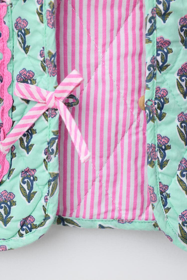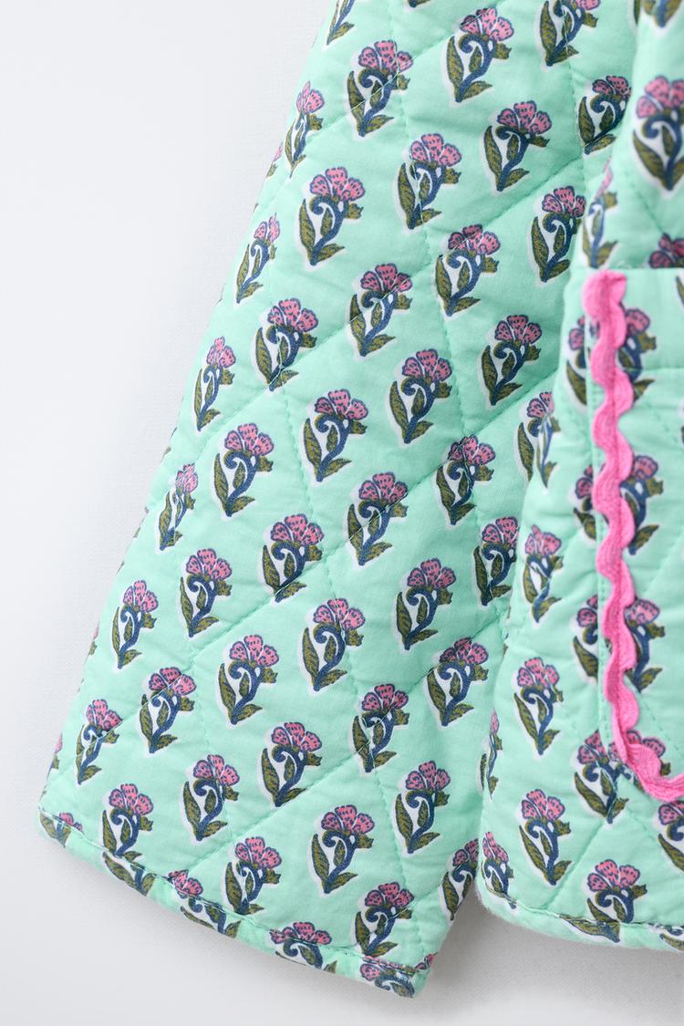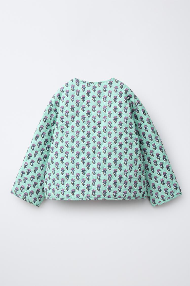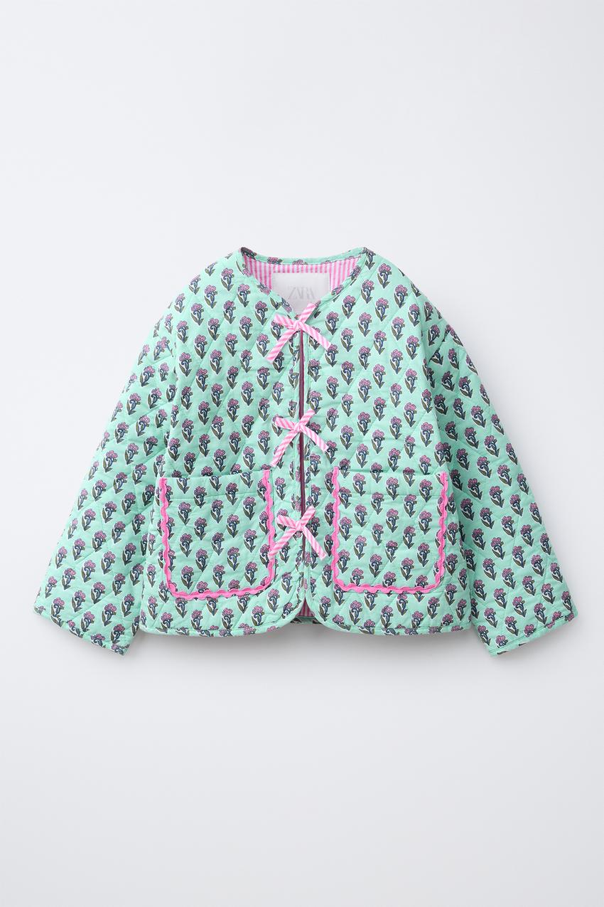 ZARA СТЕГАНЫЙ ЖАКЕТ С ЦВЕТАМИ И БАНТАМИ, СВЕТЛО-БИРЮЗОВЫЙ