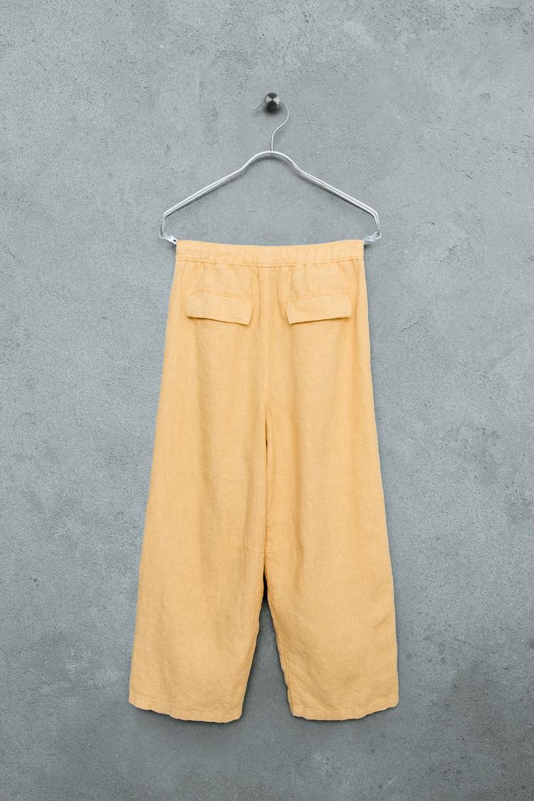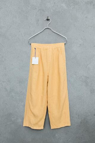 Брюки с эластичным поясом. Передние карманы и задние карманы с клапанами. Основной материал: 100% лен.