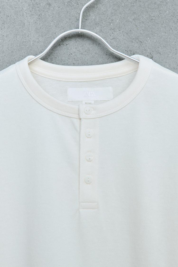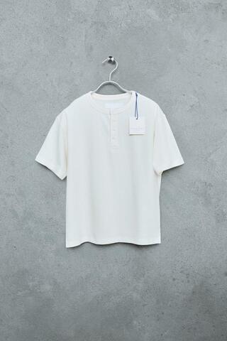 Футболка с круглым вырезом и короткими рукавами. Декорирована пуговицами на кокетке. Изготовлена из хлопка с начесом для более мягкого прикосновения.