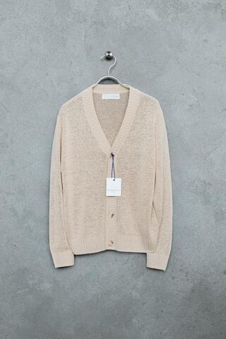 Вязаный кардиган с V-образным вырезом и длинными рукавами. Детали в рубчик. Застежка на пуговицы спереди. Изготовлен из 38% льна и 32% хлопка.