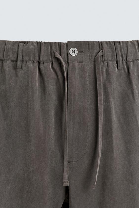 Брюки свободного кроя из струящейся смесовой ткани с лиоцеллом. Эластичный пояс на шнурке. Боковые карманы, задний прорезной карман на пуговице. Эффект потертости. Застежка-молния и пуговица.