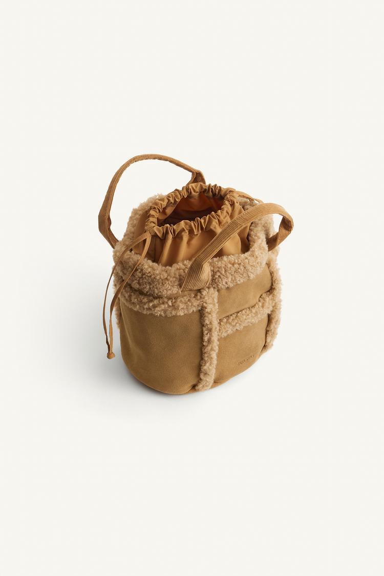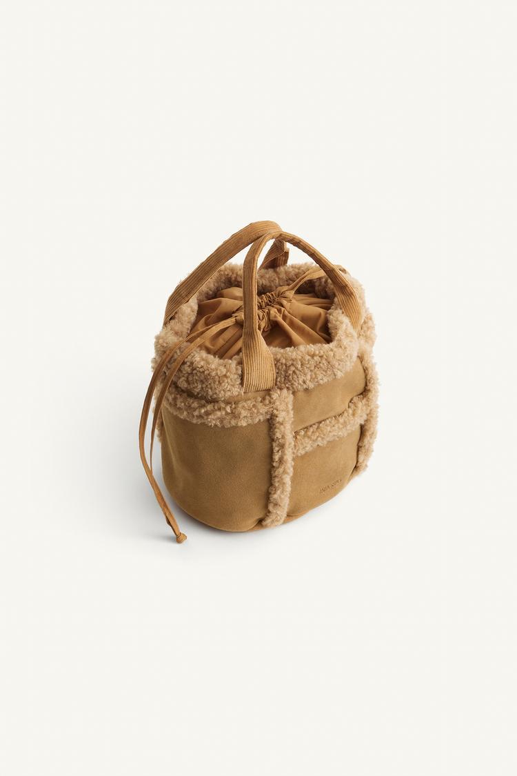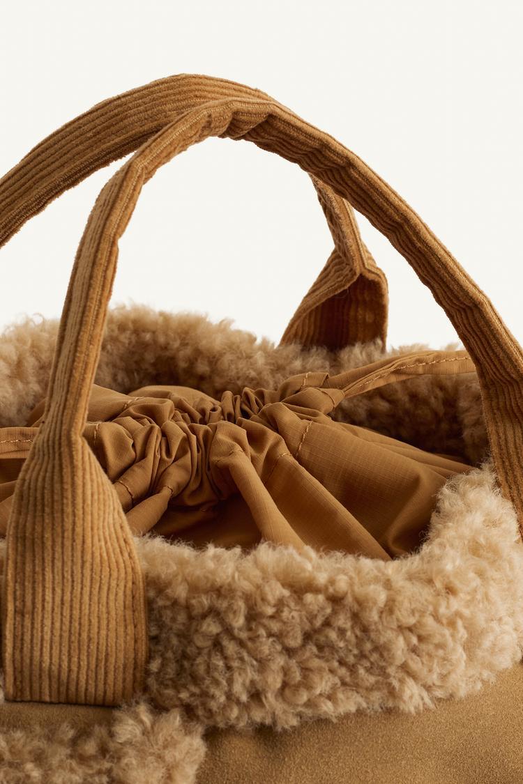 Сумка через плечо из смеси кожи и искусственной шерсти. Застежка-завязка. С двумя ручками.