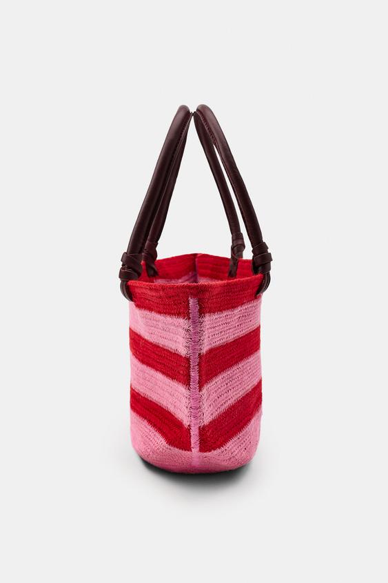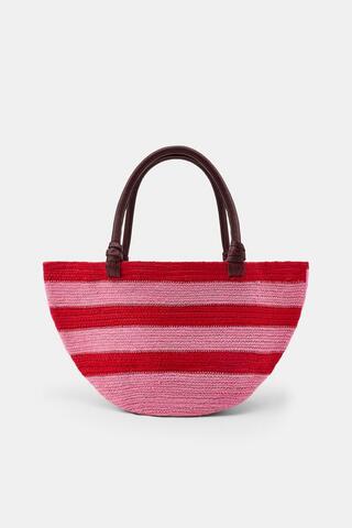 ZARA СУМКА ИЗ ДЖУТА И КОЖИ В ПОЛОСКУ, КРАСНЫЙ
