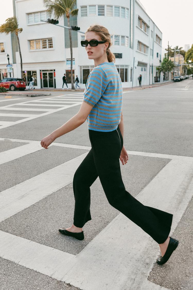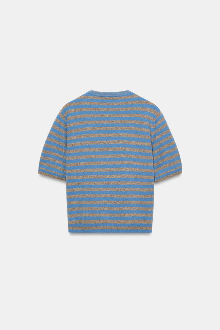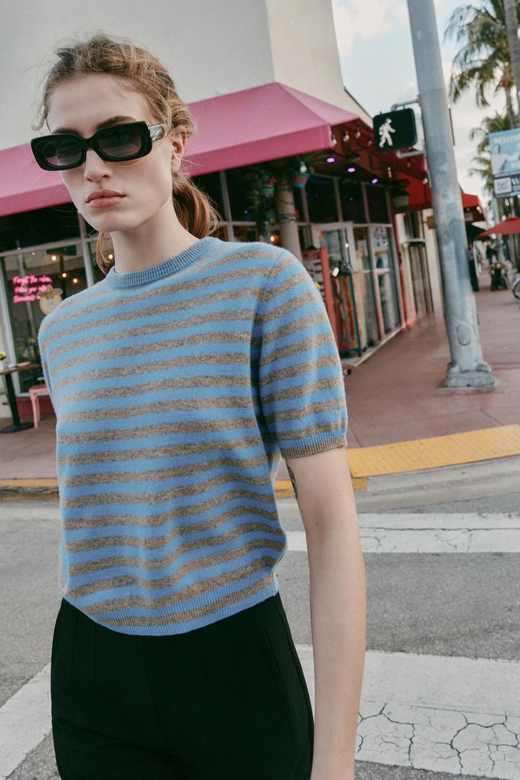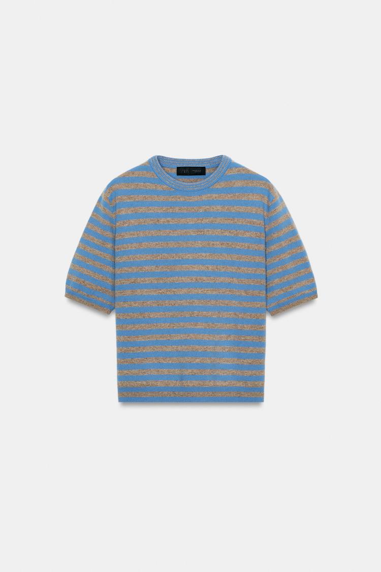 ZARA СВИТЕР ИЗ 100% ШЕРСТИ С КОРОТКИМИ РУКАВАМИ В ПОЛОСКУ, СЕРЫЙ/СИНИЙ