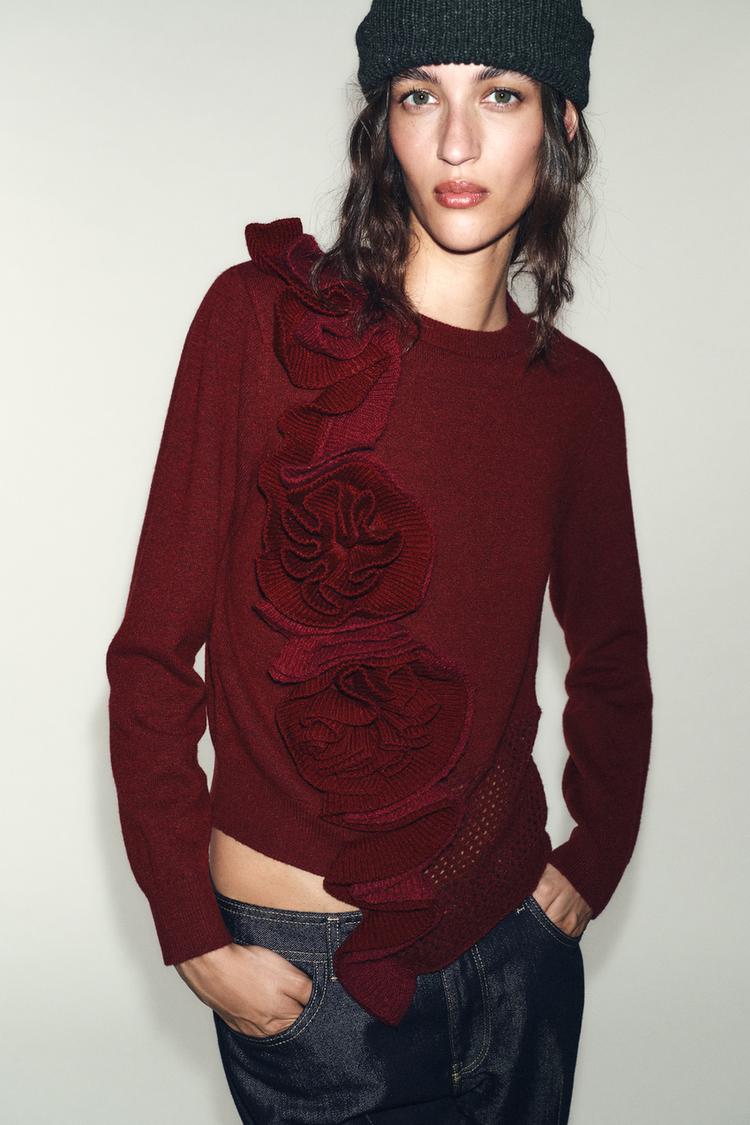 ZARA СВИТЕР ИЗ РЕЛЬЕФНОГО ТРИКОТАЖА С ЦВЕТАМИ, БУРГУНДИ