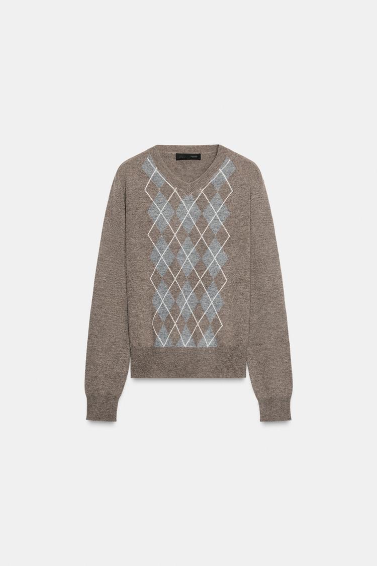 ZARA СВИТЕР ИЗ СМЕСОВОЙ ШЕРСТИ С УЗОРОМ «РОМБЫ», КОРИЧНЕВЫЙ МЕЛАНЖ