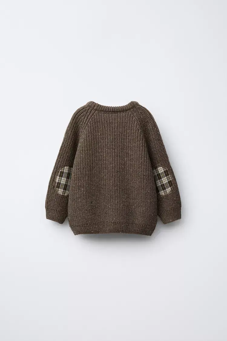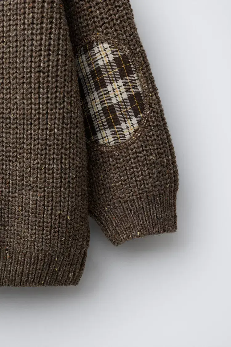 Свитер крупной вязки с круглым вырезом и длинными рукавами. Накладки на локтях с клетчатым принтом.