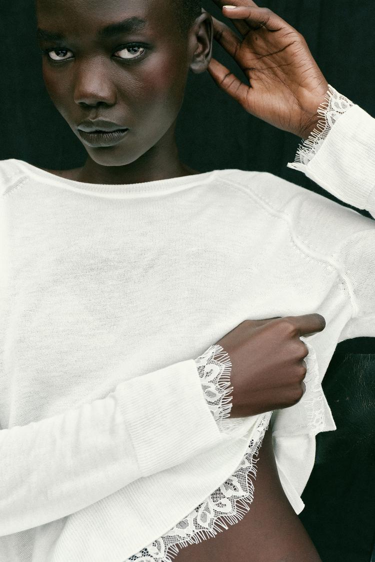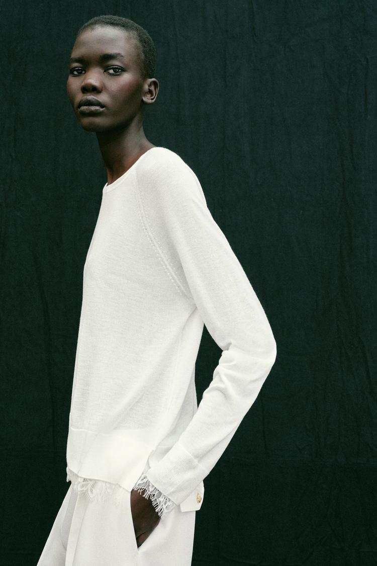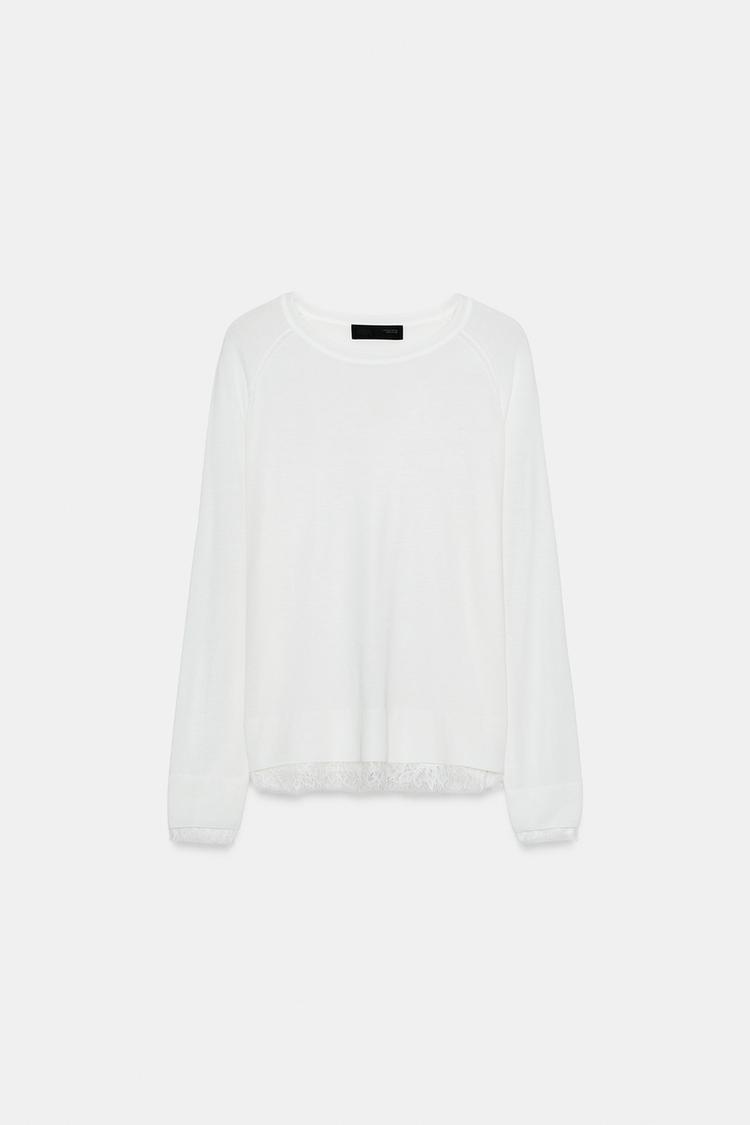 ZARA СВИТЕР С КРУЖЕВОМ, БЕЛЫЙ