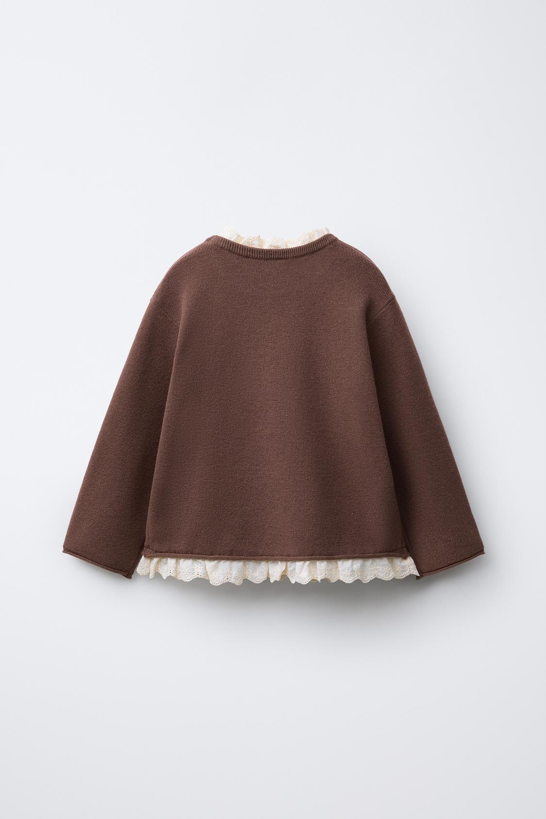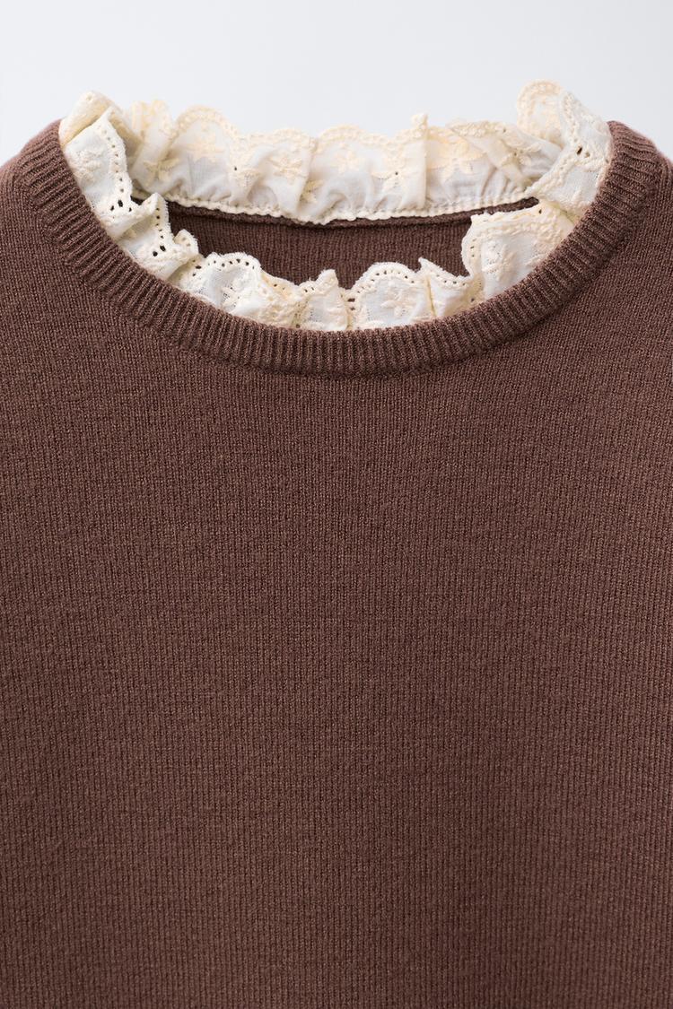 ZARA СВИТЕР С КРУЖЕВОМ И ВЫШИВКОЙ, ШКОЛАДНЫЙ