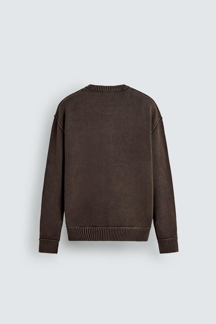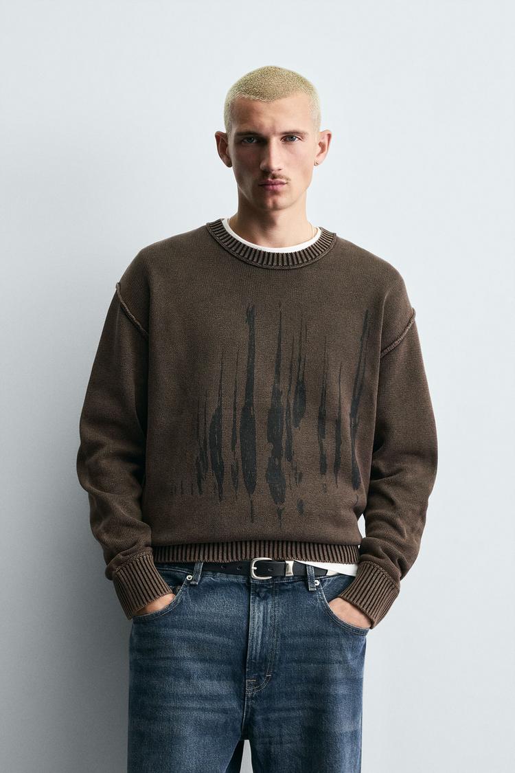 ZARA СВИТЕР С ПРИНТОМ И ЭФФЕКТОМ ПОТЕРТОСТИ, КОРИЧНЕВЫЙ