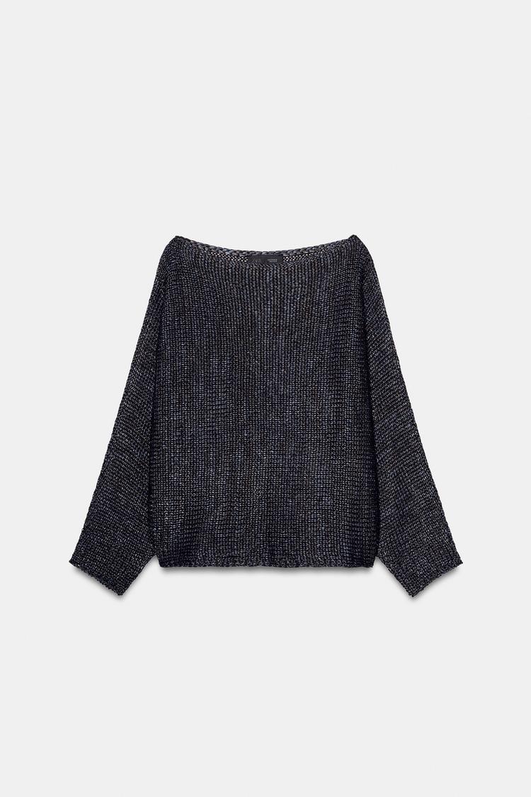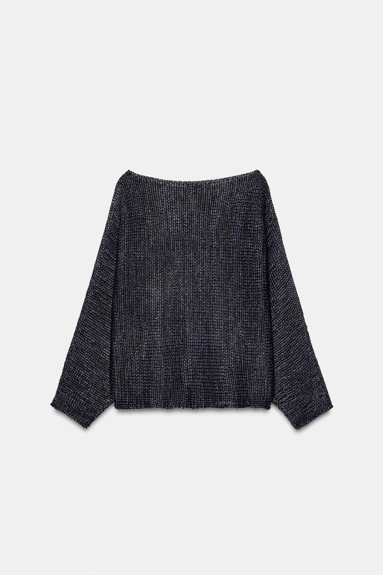 Свитер с вырезом лодочкой и широкими рукавами.