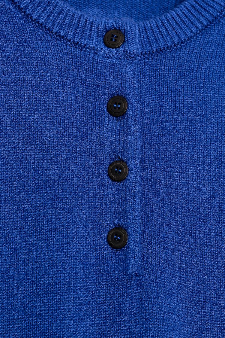 Однотонный вязаный свитер с круглым вырезом и широкими рукавами ниже локтя. Пуговицы спереди.