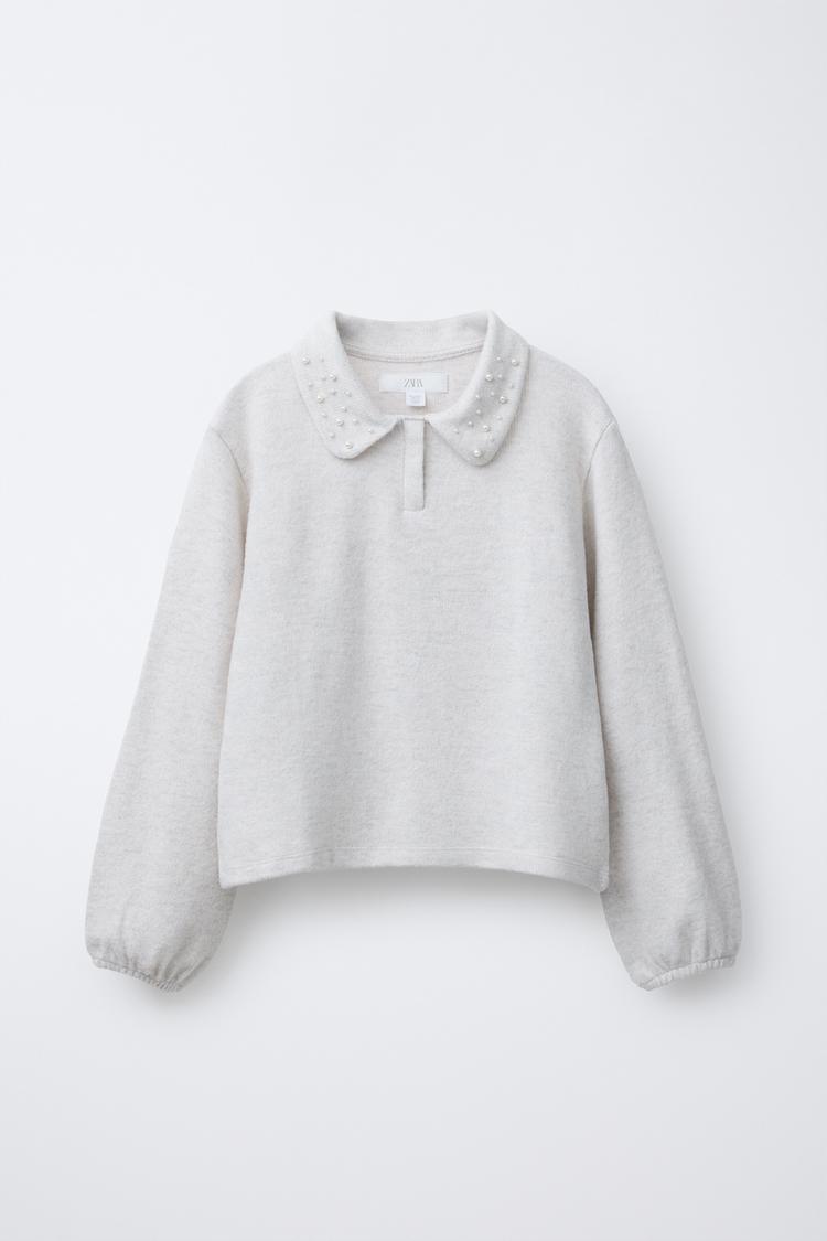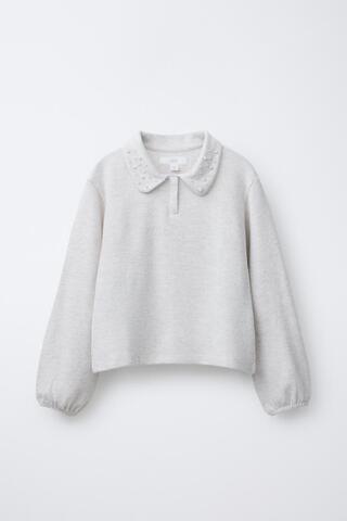Поло с воротником поло и длинными рукавами на резинке. Бусины на воротнике.