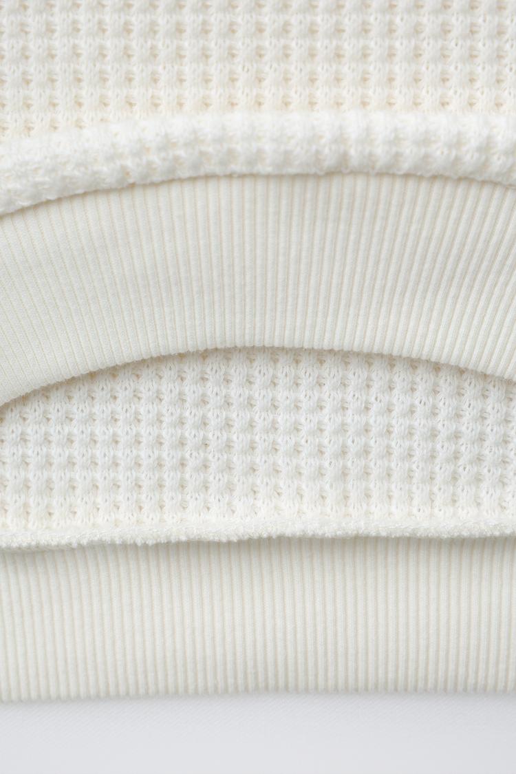 Вафельный свитер с круглым вырезом и длинными рукавами. Отделка в рубчик. Декоративная вышитая надпись спереди.