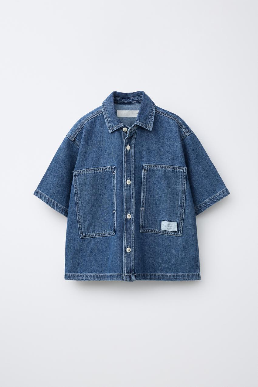 Джинсовая рубашка с воротником и короткими рукавами. Застегивается на пуговицы спереди. Накладные карманы спереди с этикеткой.