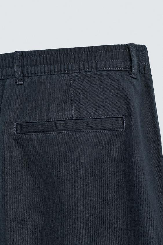 Брюки прямого кроя из струящейся ткани с хлопком и льном. Эластичный пояс. Передние карманы и задние прорезные карманы. Застежка-молния и пуговица спереди.