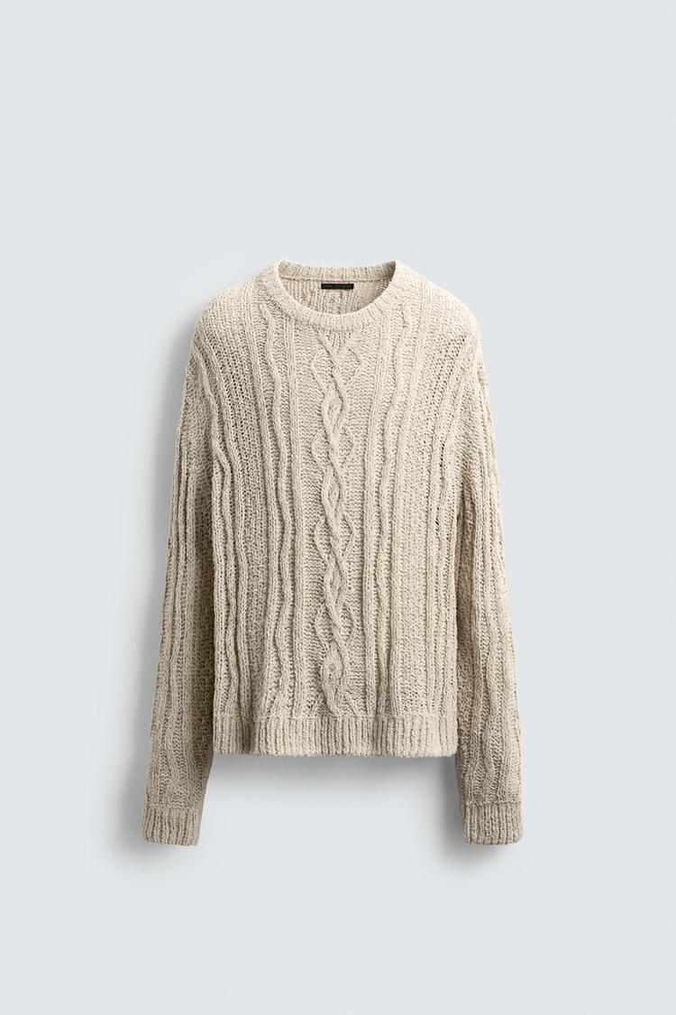 ZARA ТЕКСТУРНЫЙ СВИТЕР С УЗОРОМ «КОСЫ», КАМЕННО-СЕРЫЙ