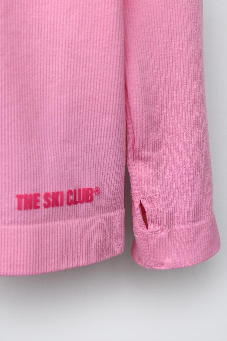 Футболка в рубчик с высоким воротником и длинными рукавами с прорезями для больших пальцев. Рельефная надпись внизу.