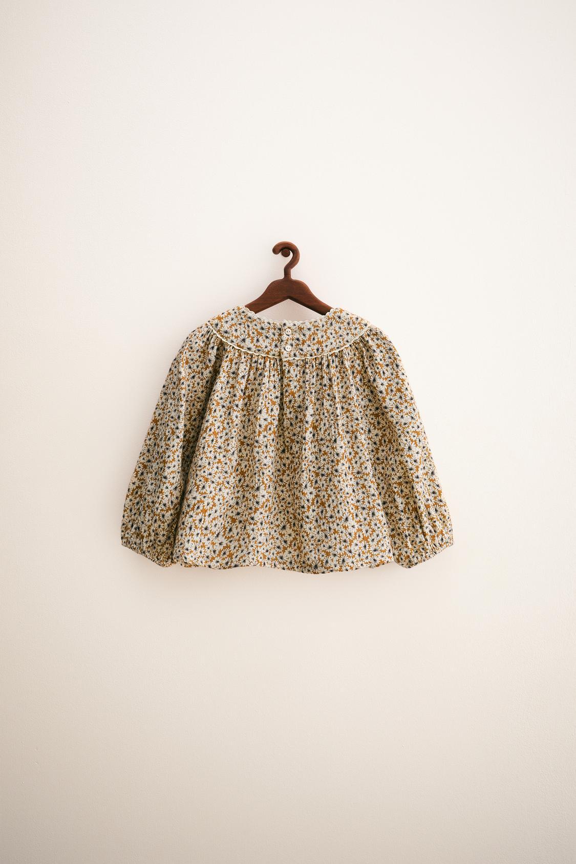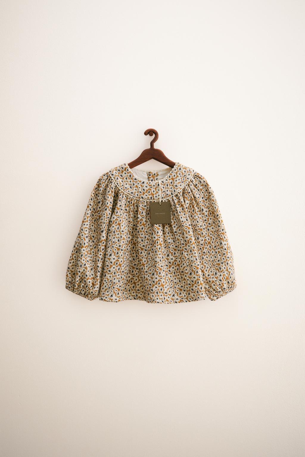 Блуза широкого кроя из хлопковой ткани. Отделка кружевом на воротнике и эластичные резинки по низу рукавов обеспечивают комфорт. Застежка на пуговицы сзади.