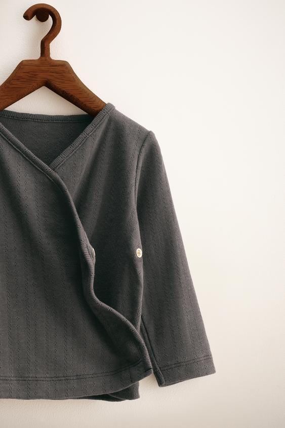 Футболка в стиле кимоно из хлопковой ткани. Модель с запа́хом и боковой застежкой на кнопки.