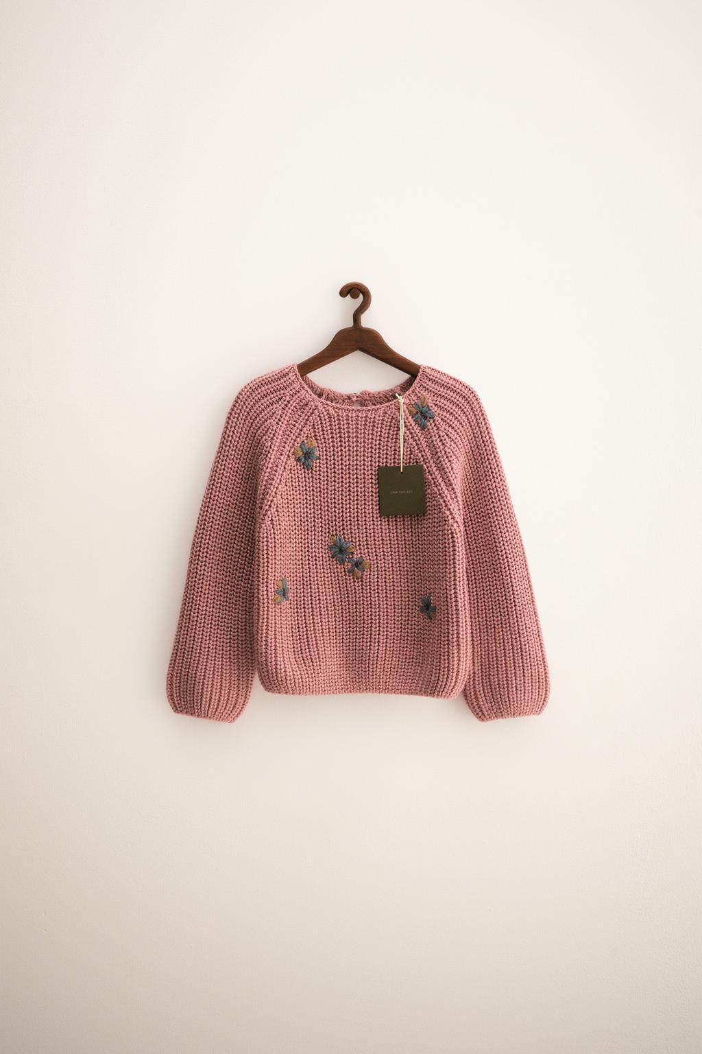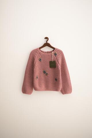 Джемпер крупной вязки из ткани с 9% содержанием шерсти. Застежка на пуговицу-капельку сзади. Спереди вышитые цветы.