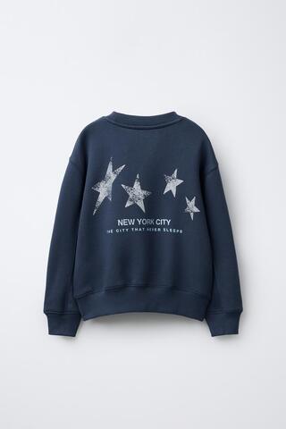 Толстовка с круглым вырезом и длинными рукавами. Детали в рубчик. Принт с текстом и звездами с блестками спереди и сзади. Внутренняя сторона с начесом, теплая и мягкая. Ткань на 80% состоит из хлопка.